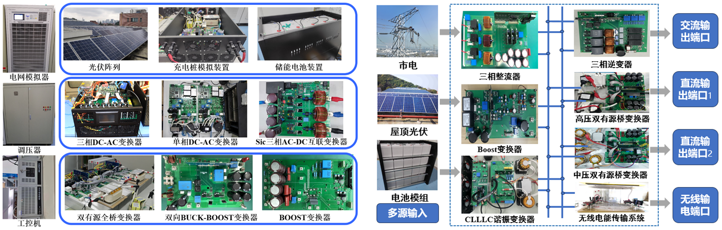 多端口能量路由实验平台:平台主要包含市电、光伏、储能3类型源侧输入端口,交流有线输出、直流有线输出、无线传输3类型荷侧输出端口。该实验平台可接纳多种能源,具备有线与无线输电两种形态,可为多类型负荷供电。基于该平台,可研究多能源电力电子互联组网的有线/无线多模式自适应供电系统能量路由技术等。