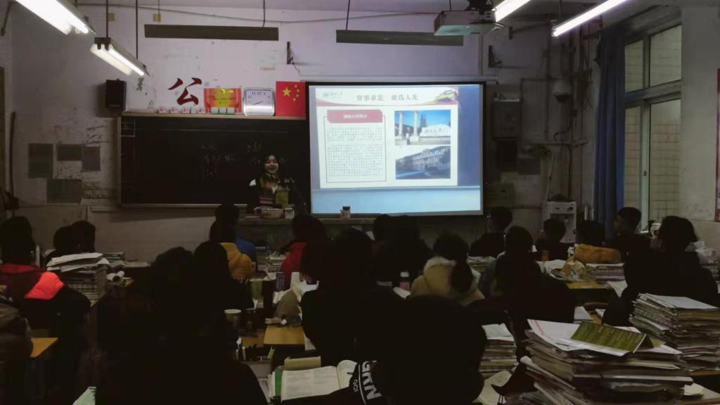 刚走上讲台的时候还有些紧张,当我做完自我介绍,听到学弟学妹们热烈的掌声,看着他们真挚的眼神,似乎松了一口气。我首先对湖大进行了简单的介绍,除了我校优异办学情况、千年历史传承,我还给学弟学妹们讲了丰富的校园生活,学习、社团、学校或者班级组织的各种活动;当然,在5A级岳麓景区旁边、不设围墙的美丽校园里边读书,也让我在学弟学妹面前“炫耀”了一把,同时也鼓励他们努力学习,将来能考上湖大。