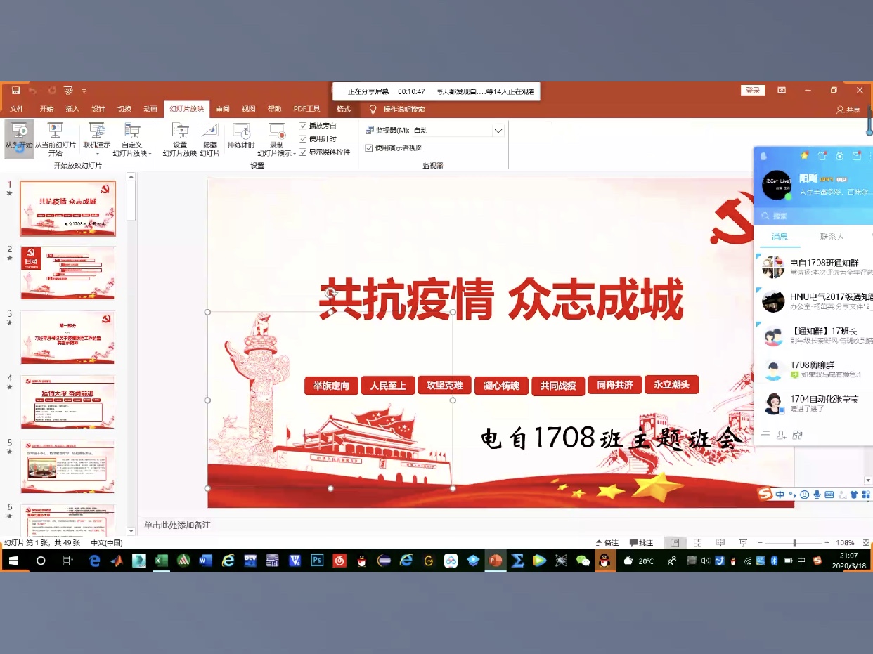 为更好地推进疫情防控工作的进行,提升“疫情防控思政大课”的学习效果,坚定班级同学齐心共抗疫情的决心,2020年3月18日晚上,电气工程及其自动化1708班开展了“共抗疫情,爱国力行”为主题的线上班会。本次会议由班长高连松同学主持,宣传委员潘越同学作会议记录,并邀请了班级在抗战疫情中表现优秀的同学作分享。