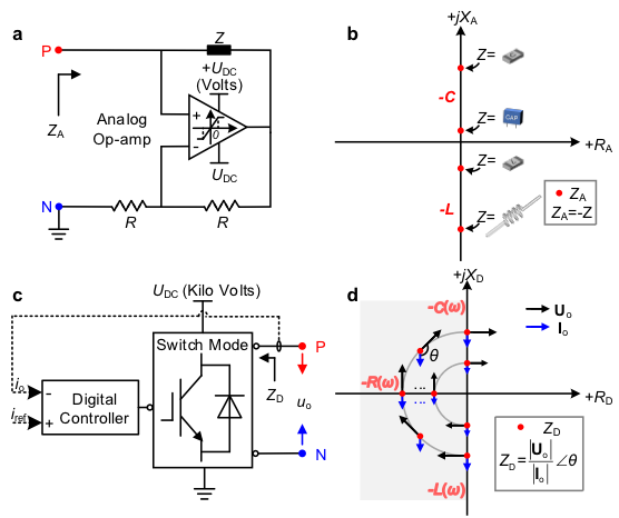 (a)以正反馈运算放大器为核心元件的模拟non-Foster电路。(b)模拟non-Foster电路离散的负阻抗特性参数空间。(c)基于开关电力电子器件和数字控制器的数字non-Foster电路。(d)数字non-Foster电路连续的具有频散效应的等效负阻抗特性参数空间。