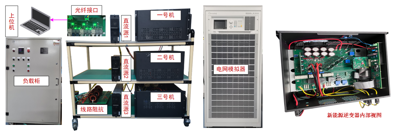 多构网/跟网混合型新能源逆变器并网实验平台:平台主要由380V/10kW新能源逆变器、直流源、电网模拟器、负载柜、上位机等组成,可在该平台上进行构网型、跟网型、或构网/跟网混合型新能源多机并联系统的稳定控制技术实验验证,可开展新能源多机并网系统稳定性机理研究等。