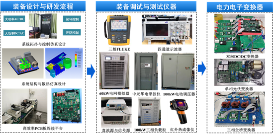 (1)电力电子变换器研发平台:该平台主要用于新能源发电变换器、大功率特种电源、电能质量治理装备等电力电子装备的研发及制造,主要包括装置拓扑与控制仿真设计、装置结构与散热仿真设计、高效率PCB板焊接、装置系统集成与调试等几个关键环节所用的仪器与设备,如图1所示。