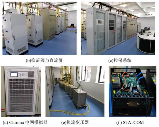(2)1600V单极双12脉波特高压直流输电物理模拟平台:该平台是以酒湖工程为原型缩建的1600V单极双12脉波高压直流输电物理模拟平台,额定传输功率为100kW,额定直流电压为1600V。具体构成如图2所示,主要由送端换流阀组、受端换流阀组、直流线路模拟、交流电网模拟、控制保护系统、传感与测量系统六部分组成。该平台可对受端电网各类故障导致的换相失败过程进行准确复现,可为研究高压直流输电系统换相失败的发生机理提供平台基础,也可对新型换相失败防御方法进行动模实验验证。