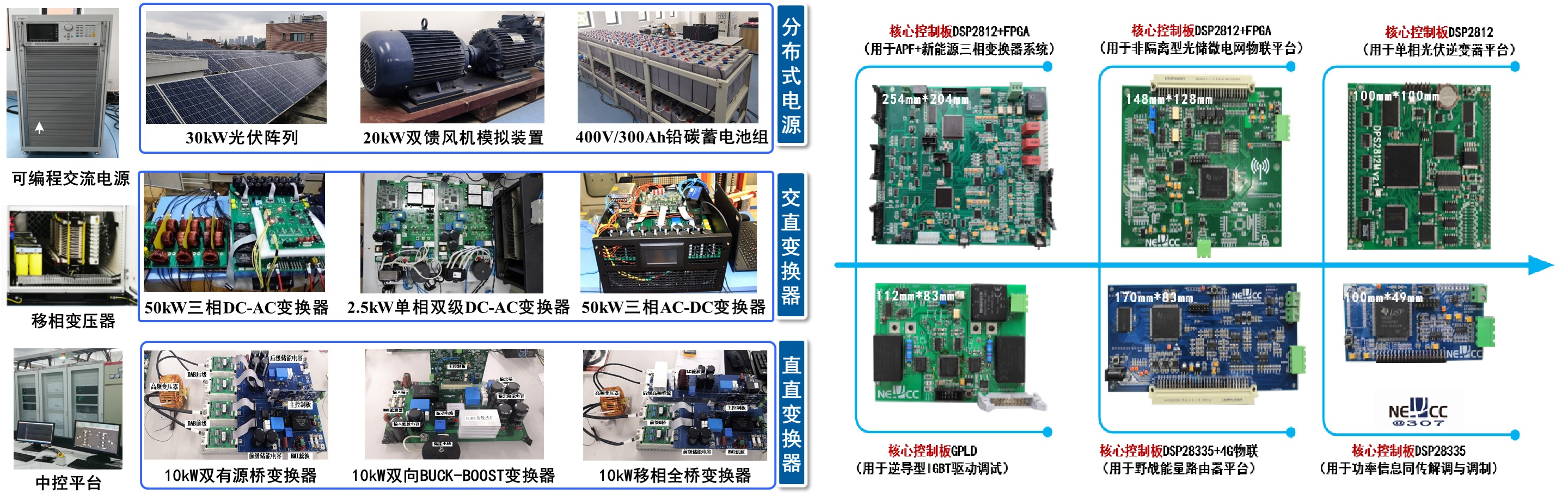 课题组现有实验平台均由学生自主设计搭建完成,目前已完成多能源交直流微电网与特种能量路由器平台的搭建。未来,课题组将持续致力于高能冲击下特种电能变换、新一代微电流通信、工业高密度腐蚀电流吸收等方面的研究。